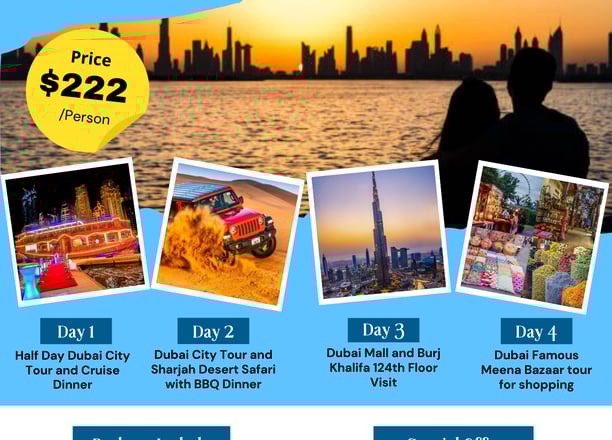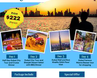 Hotel rooms, Breakfast & Dinner, Burj Khalifa Ticket & Local Transportation.